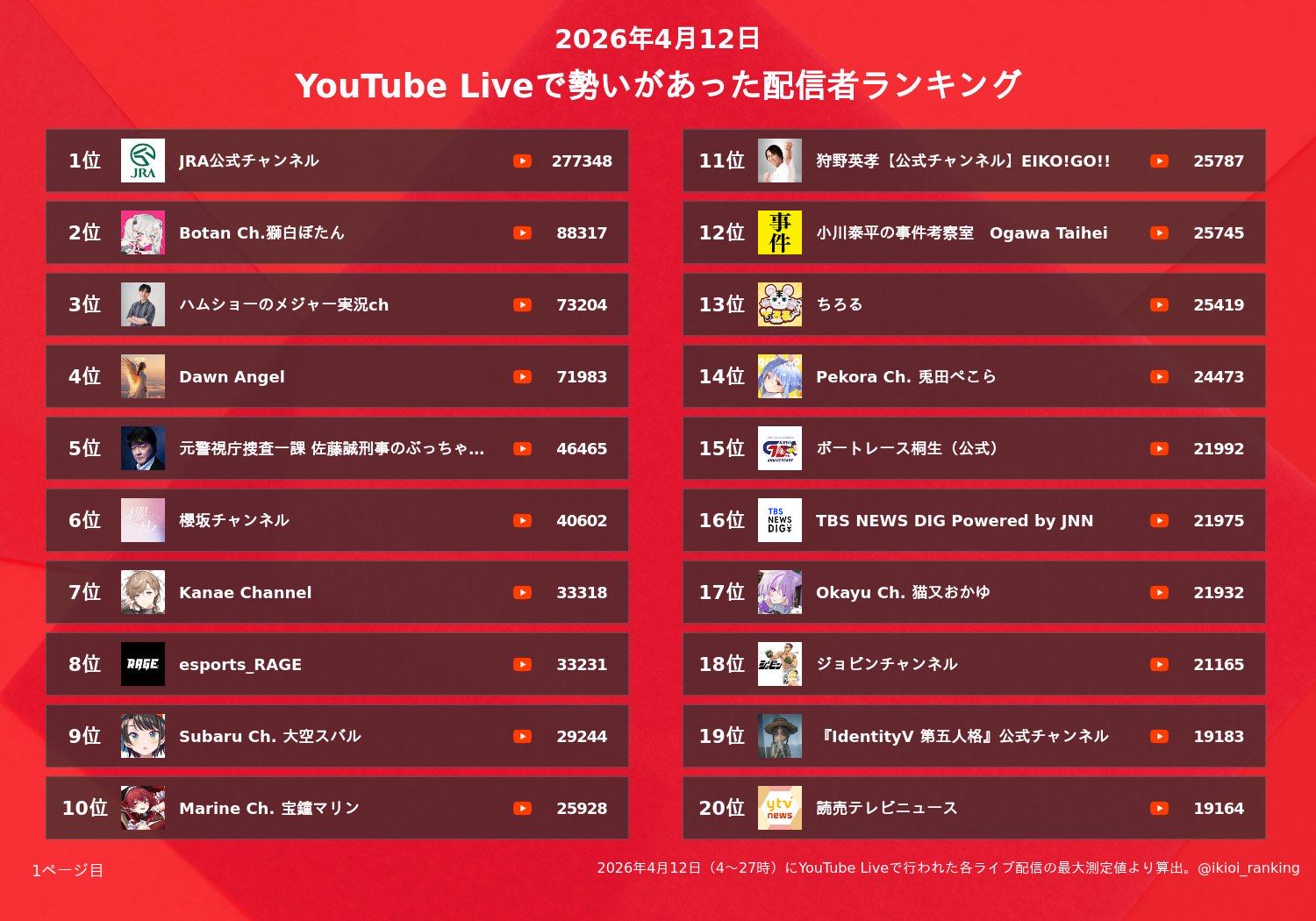 | … | 1826/04/17(金)07:26:41No.1421067827+>あんまり大きいコンテンツになると今度は自前チャンネルYouTubeツイッターで同じものを並行配信するので |