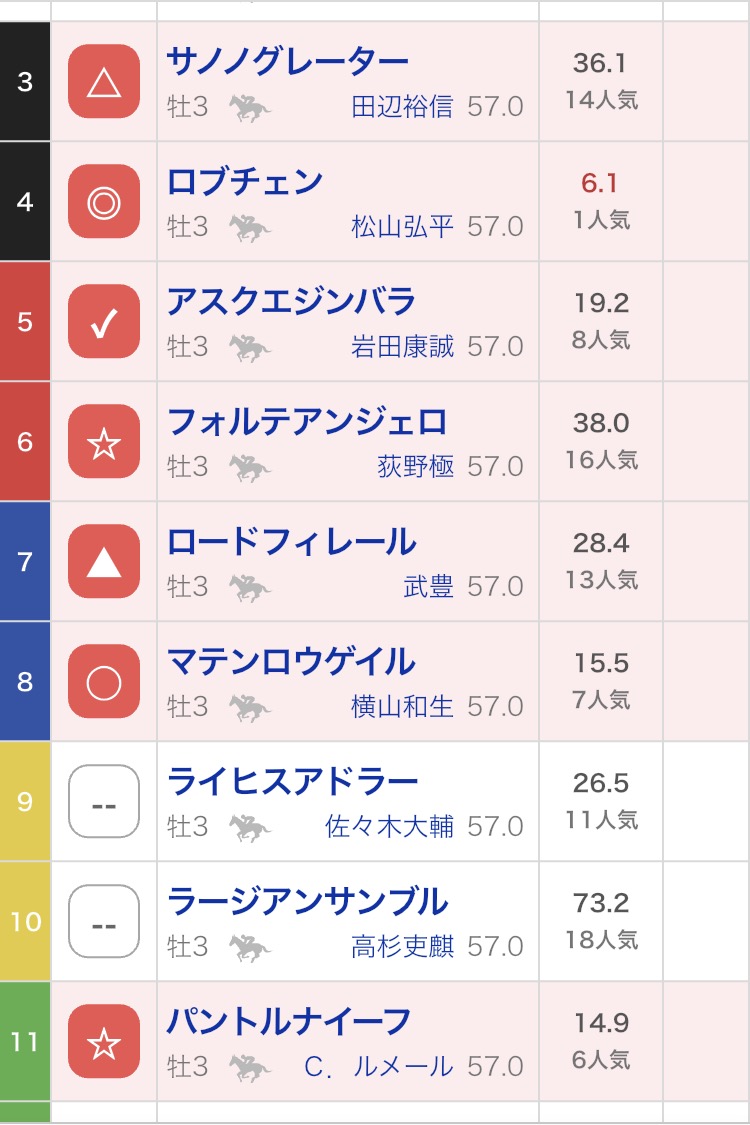 | … | 16426/04/17(金)08:48:50No.1421079897+>土田君は厳しいとしても騎乗経験のある難ちゃん江田勇差し置いてテン乗り水沼君が乗るのは流石に陣営の誰かの強い希望がありそうなんですよね |