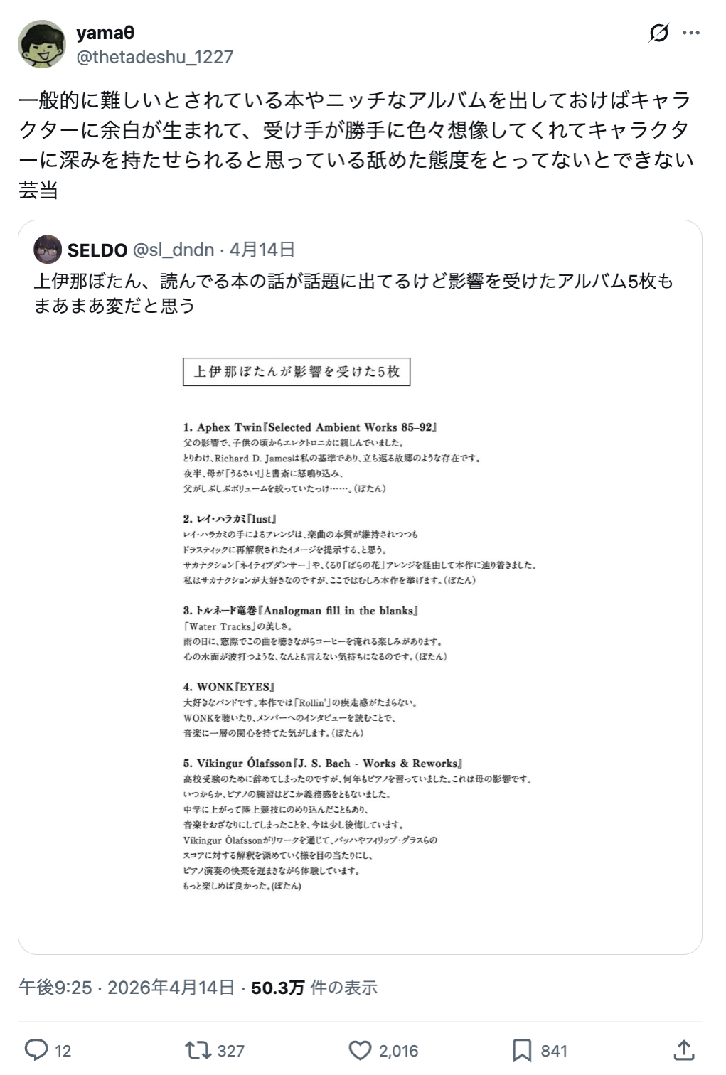 | … | 4126/04/17(金)09:25:10No.1421085599そうだねx1読んでる本の紹介とか聞いてる音楽の紹介って親近感もって貰うのが目的なのに |