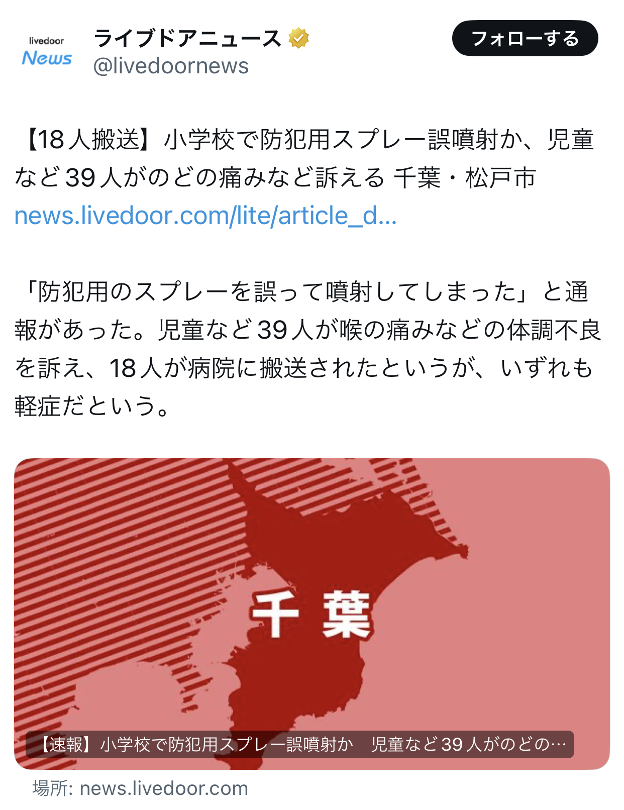 | … | 1926/04/17(金)10:43:04No.1421097669+>女子児童2人は休み時間に教室前の廊下で、別の女子児童が自宅から持参した防犯スプレーを2回噴射した。 |