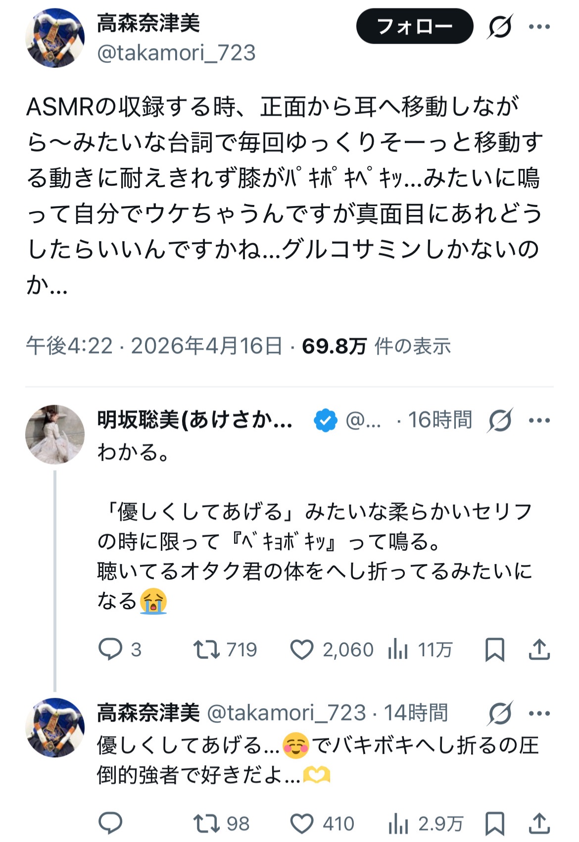 | … | 326/04/17(金)10:56:30No.1421099933そうだねx25優しい囁きの話かと思ったら切実な膝の話だった |