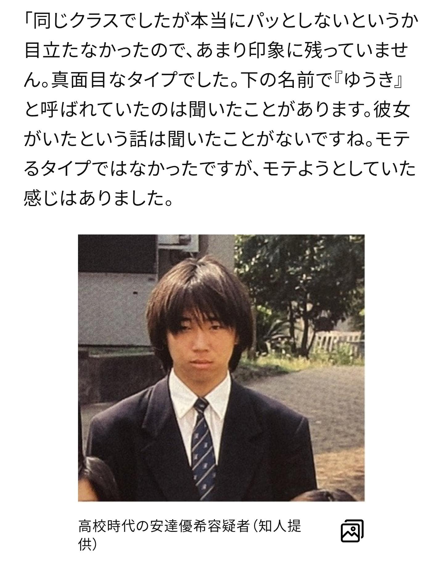 | … | 28126/04/17(金)15:37:18No.1421158573+>過去に安達容疑者が開設したSNSアカウントでは、"みっちゃん"を自称していた。プロフィール欄では、スポーツや音楽鑑賞などを趣味に並べ、好きな音楽は〈アジカン、ELLEGARDEN、RADWIMPS〉、好きなゲームは〈FF、ドラクエ〉、好きな漫画は〈ONE PIECE、ドラゴンボール〉とメジャーなアーティストや作品を挙げている。 |