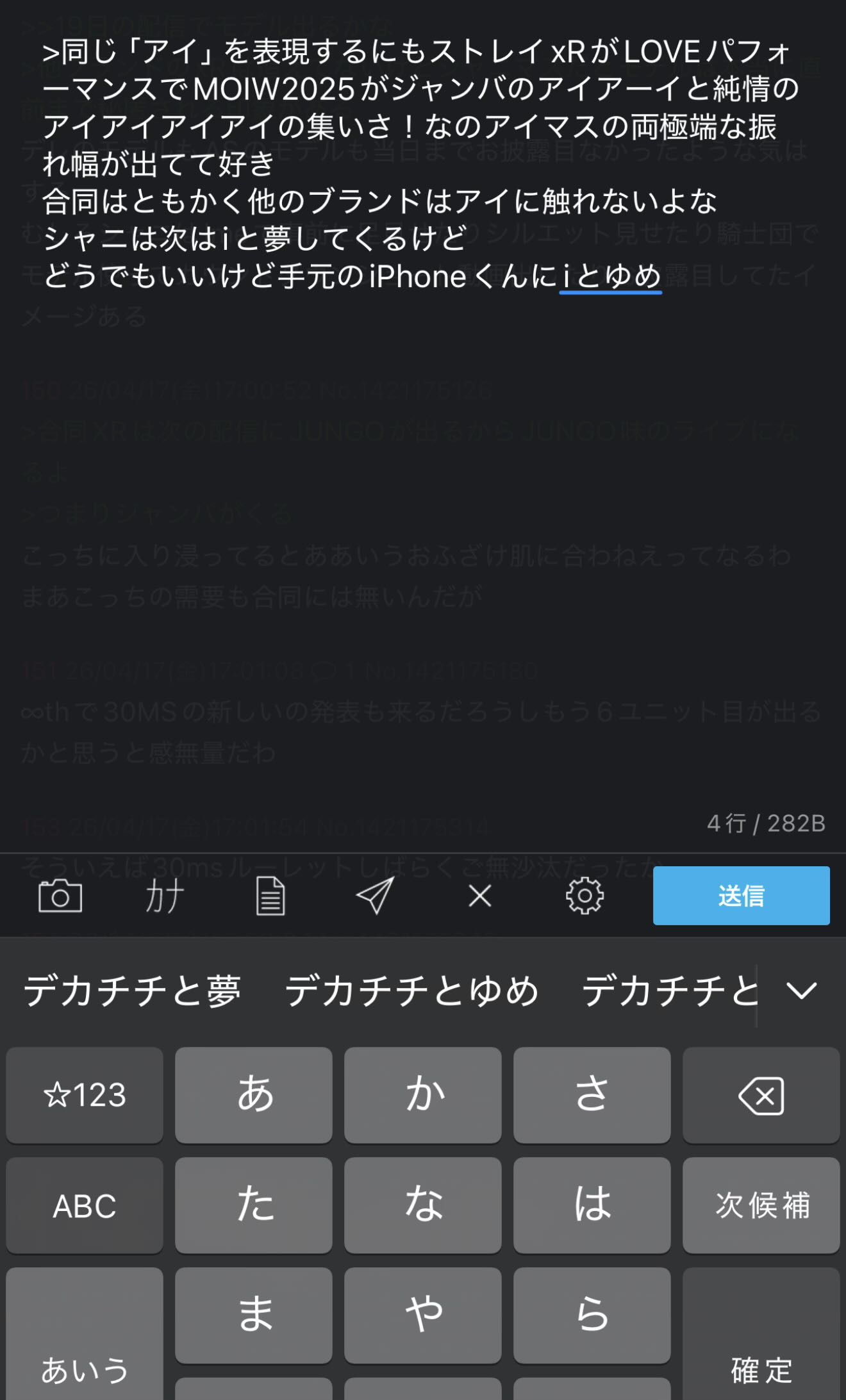 | … | 16626/04/17(金)17:09:08No.1421176710+>>どうでもいいけど手元のiPhoneくんにiと夢で変換したら頭おかしい変換してきやがった |