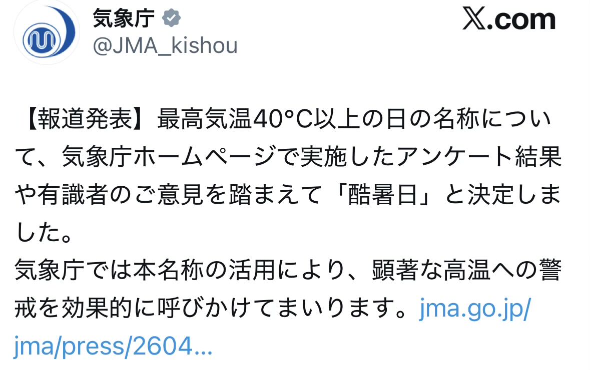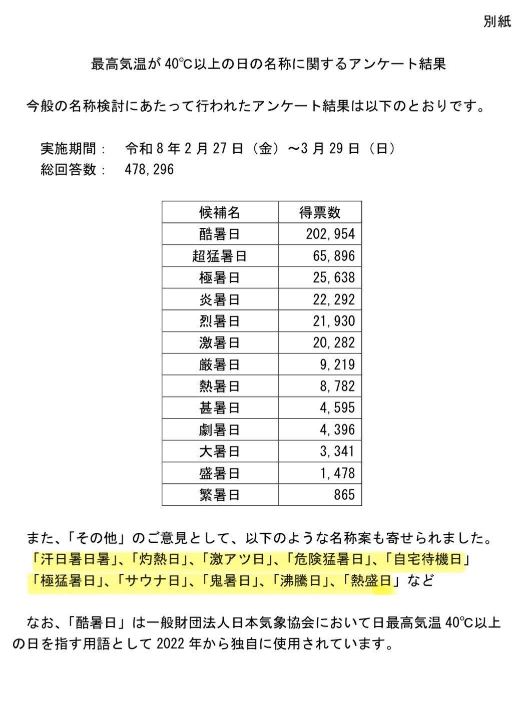 | … | 1226/04/17(金)14:12:05No.1421141842+>40度以上の新名称を募ったアンケートの総回答数は47万8296件に上った。自由記述では「灼熱日(しゃくねつび)」「激アツ日」「自宅待機日」「サウナ日」「汗日暑日暑(あせびしょびしょ)」「鬼暑日」「沸騰日」「盆暑日(ボンジョビ)」といった名称案も寄せられた。 |