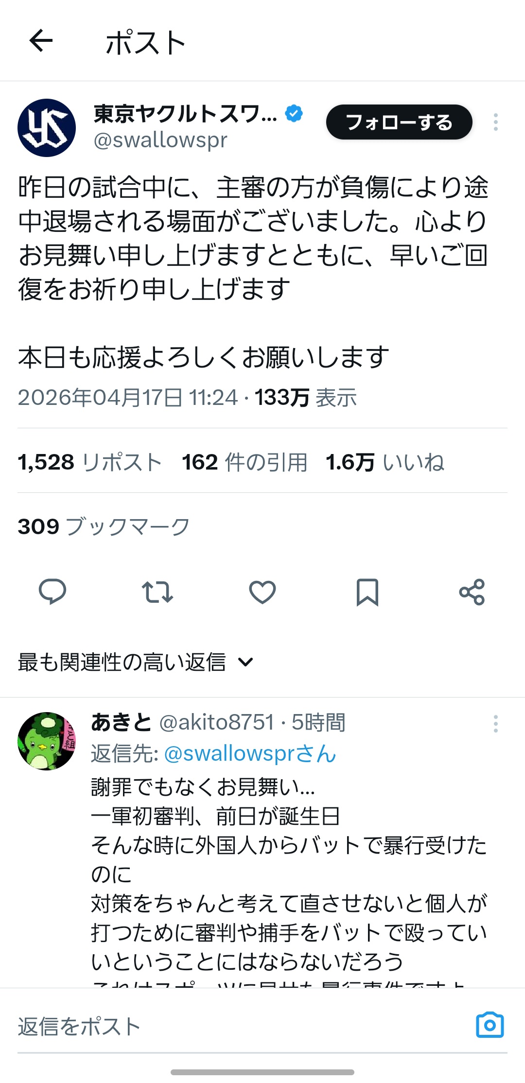| … | 7026/04/17(金)17:07:39 ID:4xaI84AANo.1421176438+昨日の試合中に、主審の方が負傷により途 中退場される場面がございました。心より お見舞い申し上げますとともに、早いご回 復をお祈り申し上げます。 |