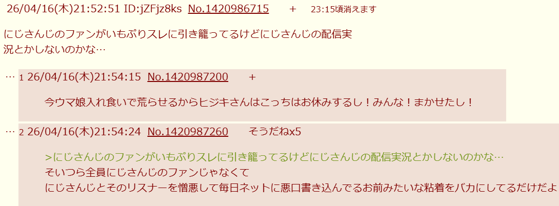 | … | 9026/04/17(金)20:41:58No.1421243697そうだねx3>X見てると思うのはにじリスさんがホロライブ見下して粘着してるの海外ニキにはとっくにバレてんだよね |