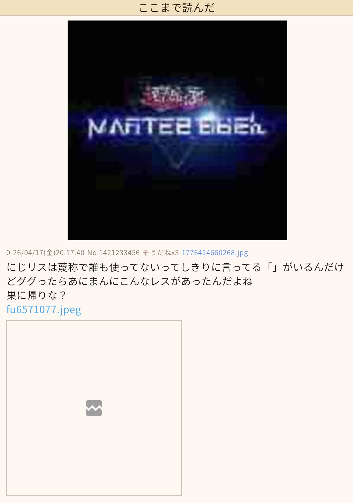 | … | 9126/04/17(金)20:42:00No.1421243718+見に行ったら6561222が一番最新の番号だった |