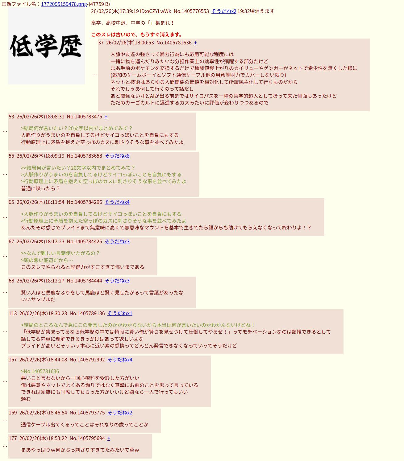 | … | 11426/04/17(金)22:08:22No.1421282922そうだねx3とにかく人に言われた事をそのまま言い返してるんだろうなってレスが痛々しい |