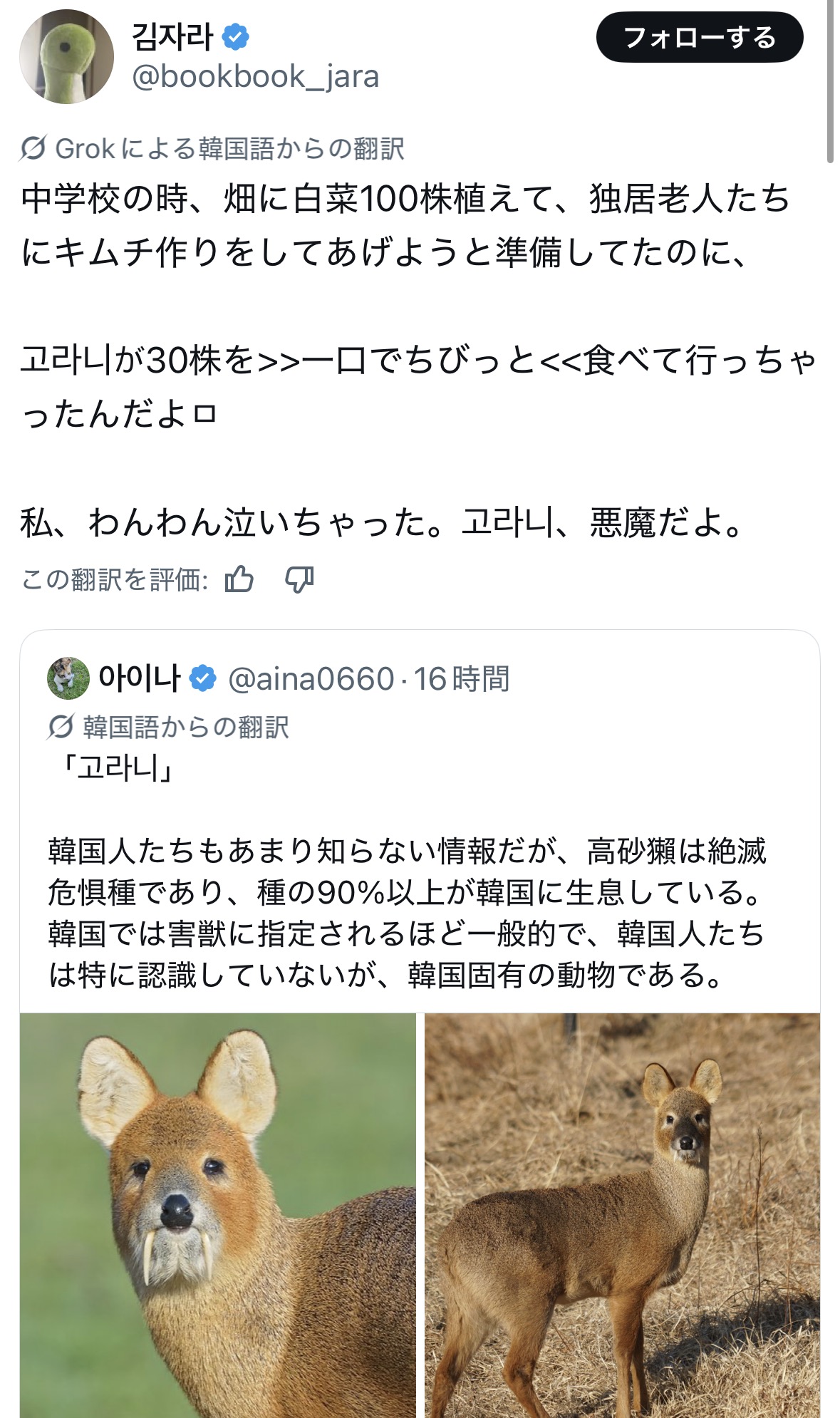 韓国の農家には必ず一人は고라니スレイヤーがいるって情報でもうダメ