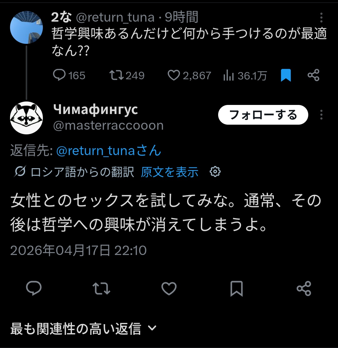 | … | 1026/04/18(土)11:55:30No.1421425570そうだねx1>人生がうまく行かない人ほど哲学が刺さるって聞いた |