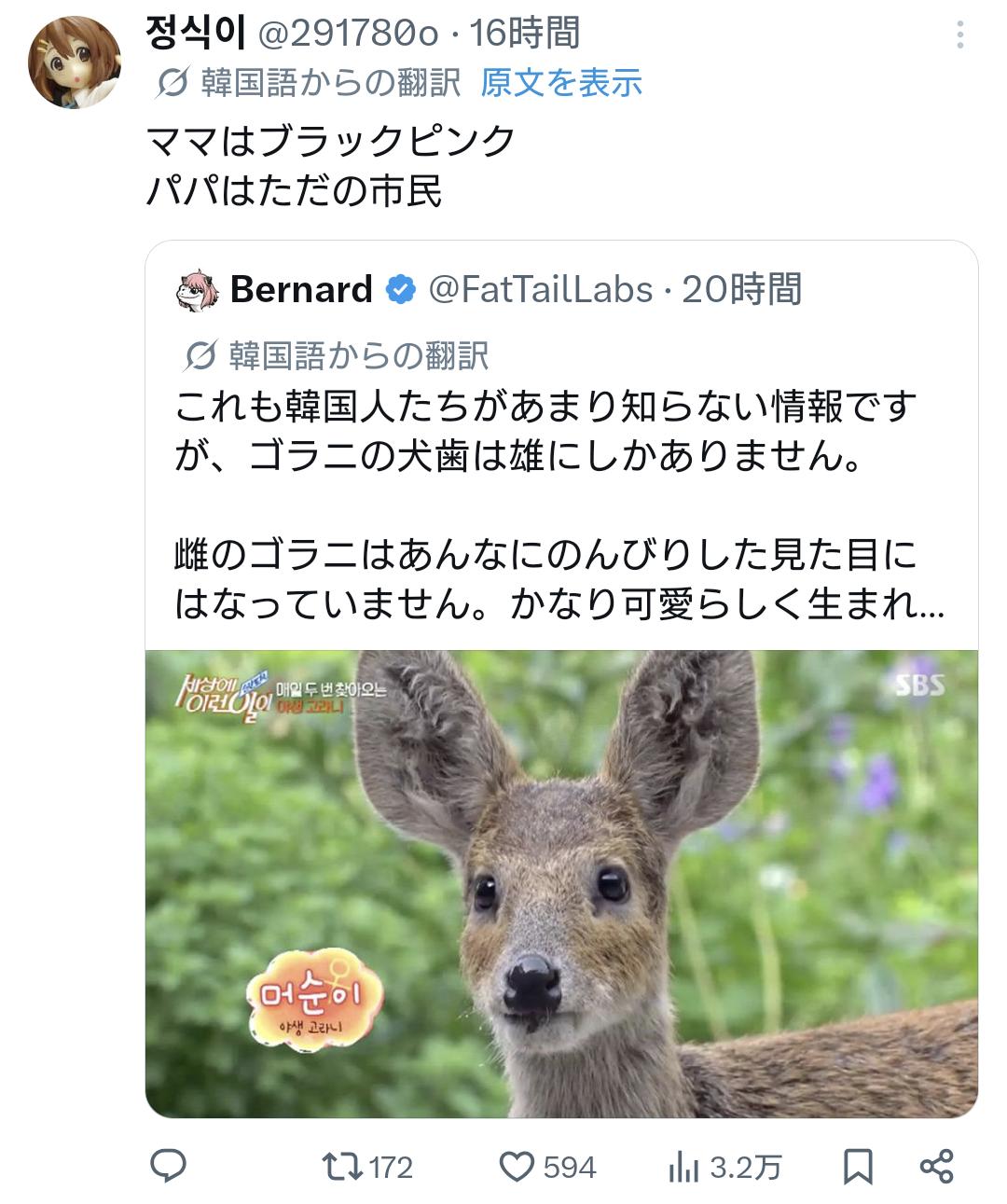 | … | 526/04/18(土)12:26:41No.1421434191そうだねx2これが고라니の鳴き声だ |