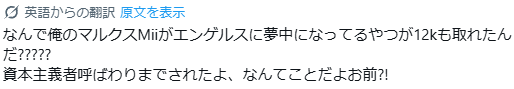 | … | 11326/04/18(土)18:55:14No.1421539208そうだねx1史実エンゲルスのマルクスに対する入れ込み具合がまずおかしい |