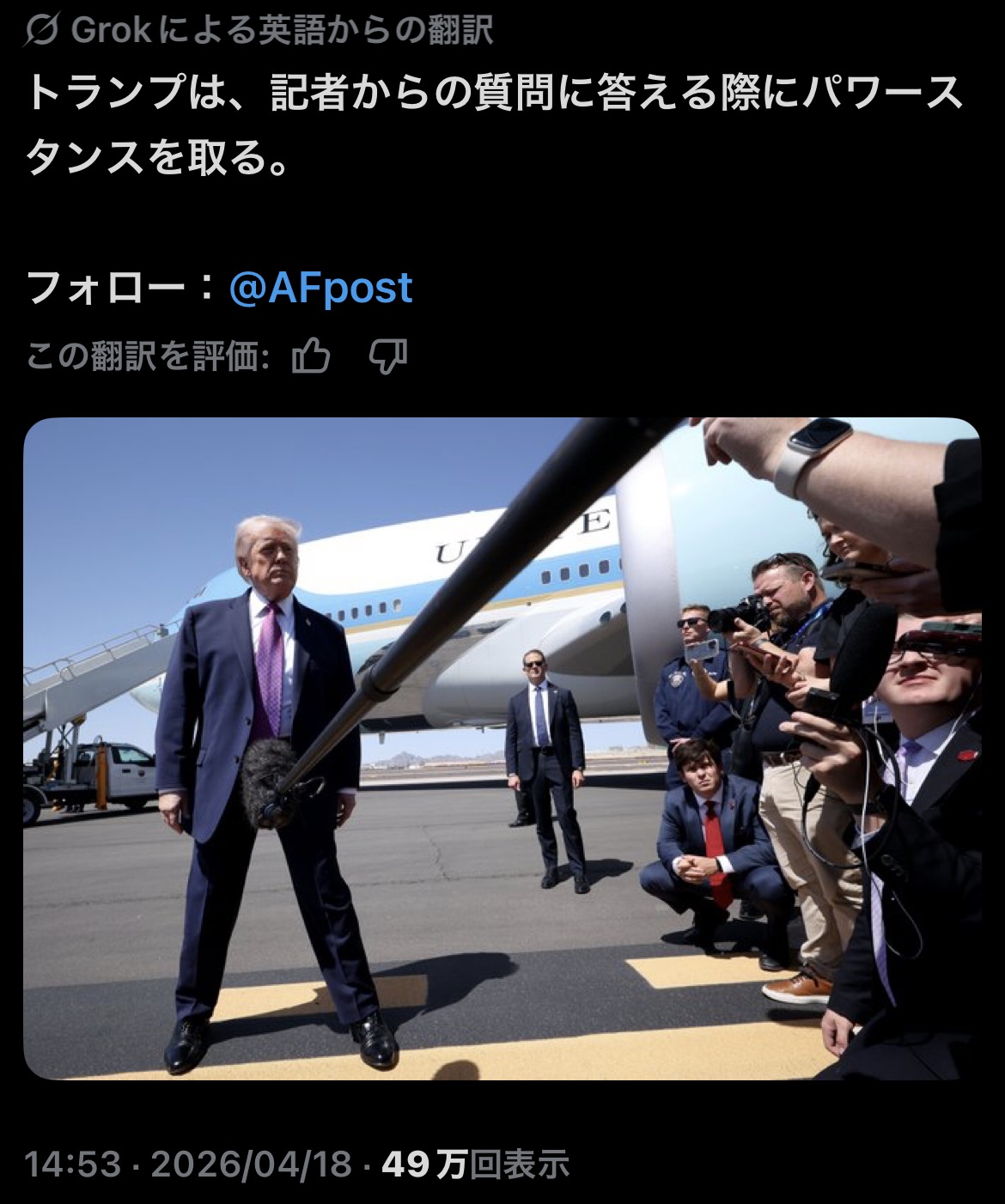 | … | 326/04/18(土)17:37:57No.1421515592そうだねx6大統領ともなるとやはりパワーが違うな |