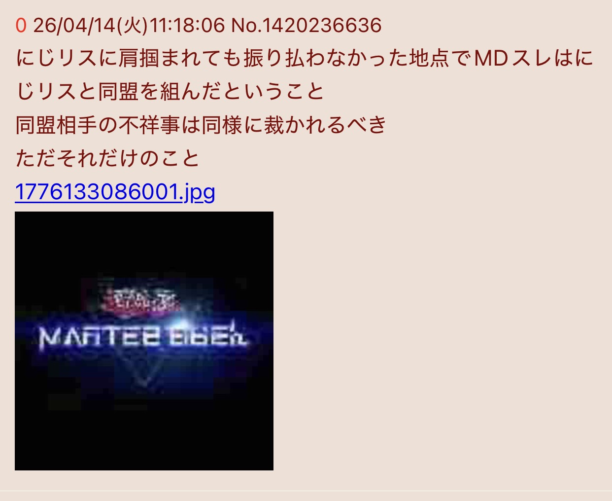 | … | 20026/04/19(日)00:56:39No.1421682446+>とか言ってるやつはファンから袋叩きにされて追い出されるだけなんだよ |