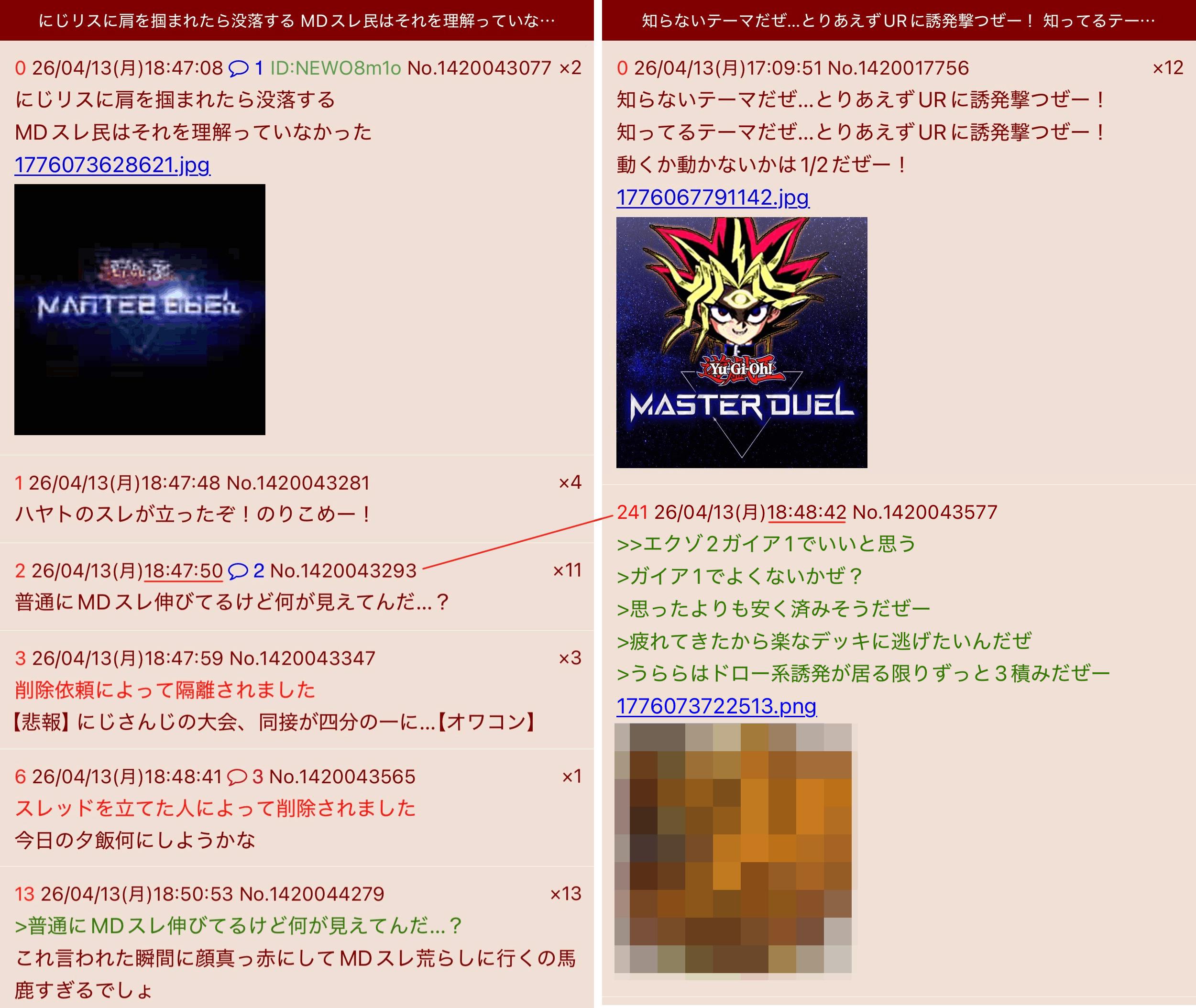 | … | 3426/04/18(土)23:58:33No.1421665443そうだねx15MDスレの住民が困惑してたのは大会実況じゃなくて大会前後からにじリスのせいで遊戯王語れない…とか言い出す馬鹿がずっと粘着スレ立て続けた挙句メアド誤爆した事だよ |
