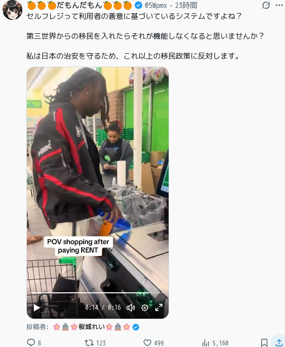 | … | 7626/04/19(日)10:17:35No.1421756523+日本人が万引きしないと思ってて草 |