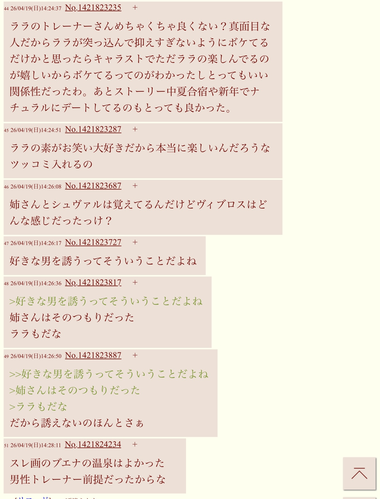 | … | 2026/04/19(日)14:15:33 ID:277vrbVYNo.1421820614+トレーナーさんみたいなボケ男モテませんよ |