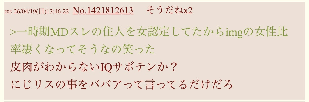 | … | 33026/04/19(日)21:40:13No.1421987876そうだねx10MDスレにV粘着しにのこのこ現れてタフ・スレと対立煽りをする |