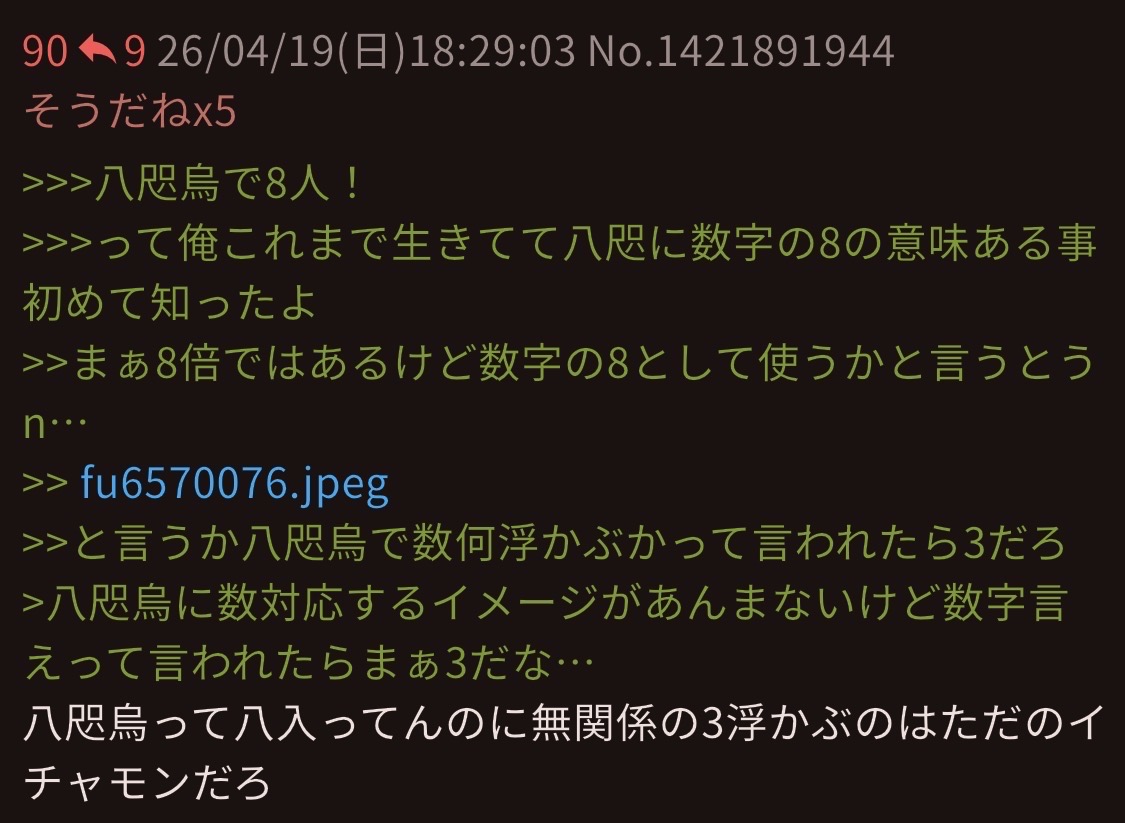 | … | 8726/04/19(日)21:09:41No.1421973932+話題に乗ってやるのもなんか癪だけど八咫烏で8は何もおかしくないだろ名前に思いっきり8入ってんじゃねえか |