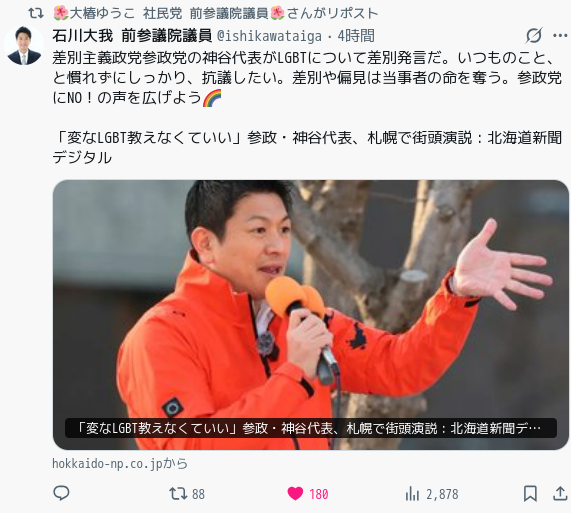 なんつーか外国人だけじゃなく性的マイノリティの人までいじめるなら政治家やめろよ…