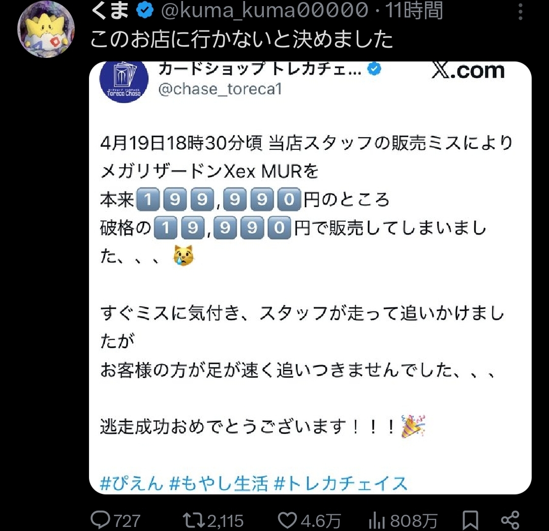 | … | 7426/04/20(月)12:08:22No.1422133303そうだねx3会計ミスと値付けミスは違うから… |