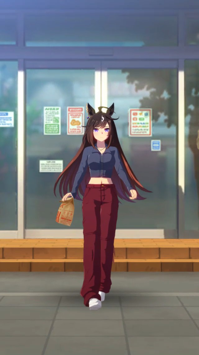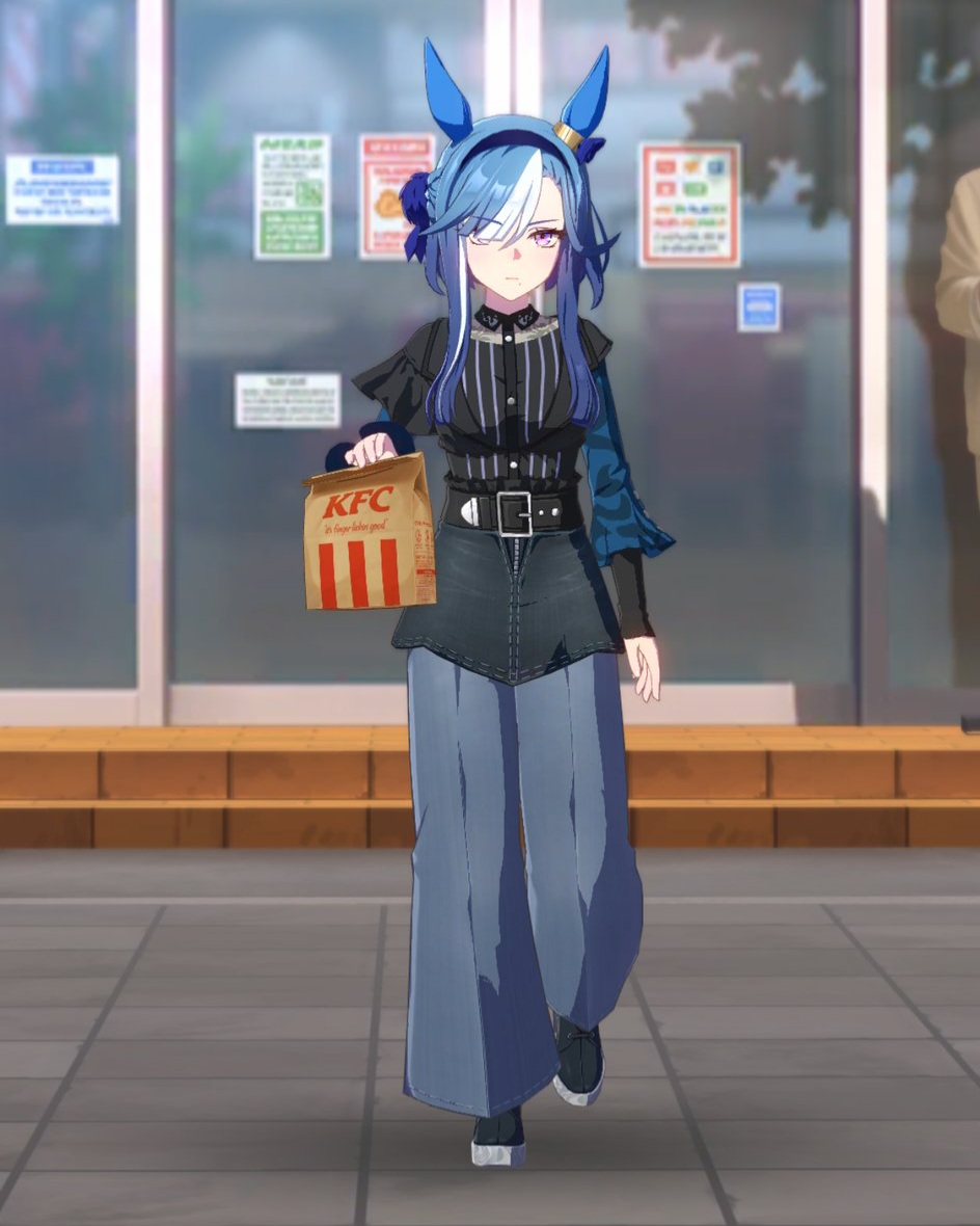 画像のお洋服ですね!ウマ娘のシュヴァルグランがKFCの紙袋を持っているというシチュエーションが可愛らしいですが、ファッション自体は非常にトレンドを押さえたスタイリッシュなものです。