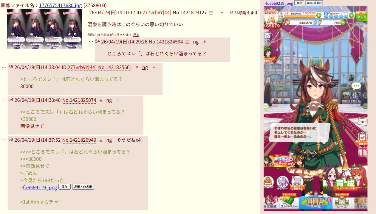 | … | 3726/04/20(月)14:43:04No.1422168429そうだねx4>温泉なんて1発引きでもしないと見れない時間だから嘘 つまり一発引きしたから見れてるだけなのでは? |