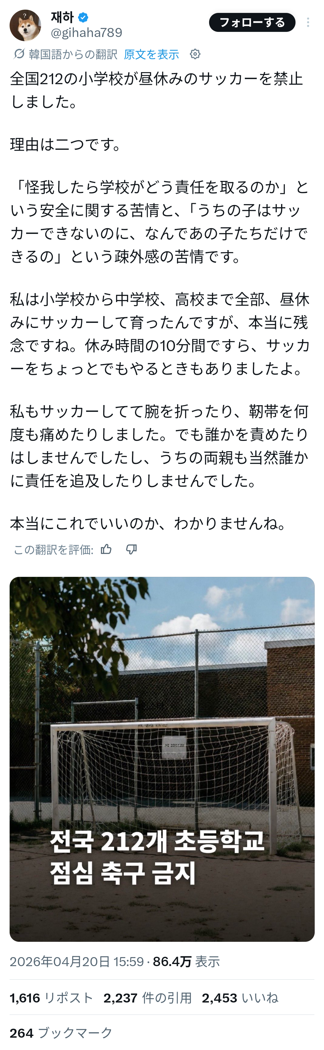 | … | 1026/04/21(火)11:55:25No.1422421084そうだねx11>サッカー取り上げても子供が遊んだら怪我するリスクは発生するから休み時間は物理拘束するしかなくないか |