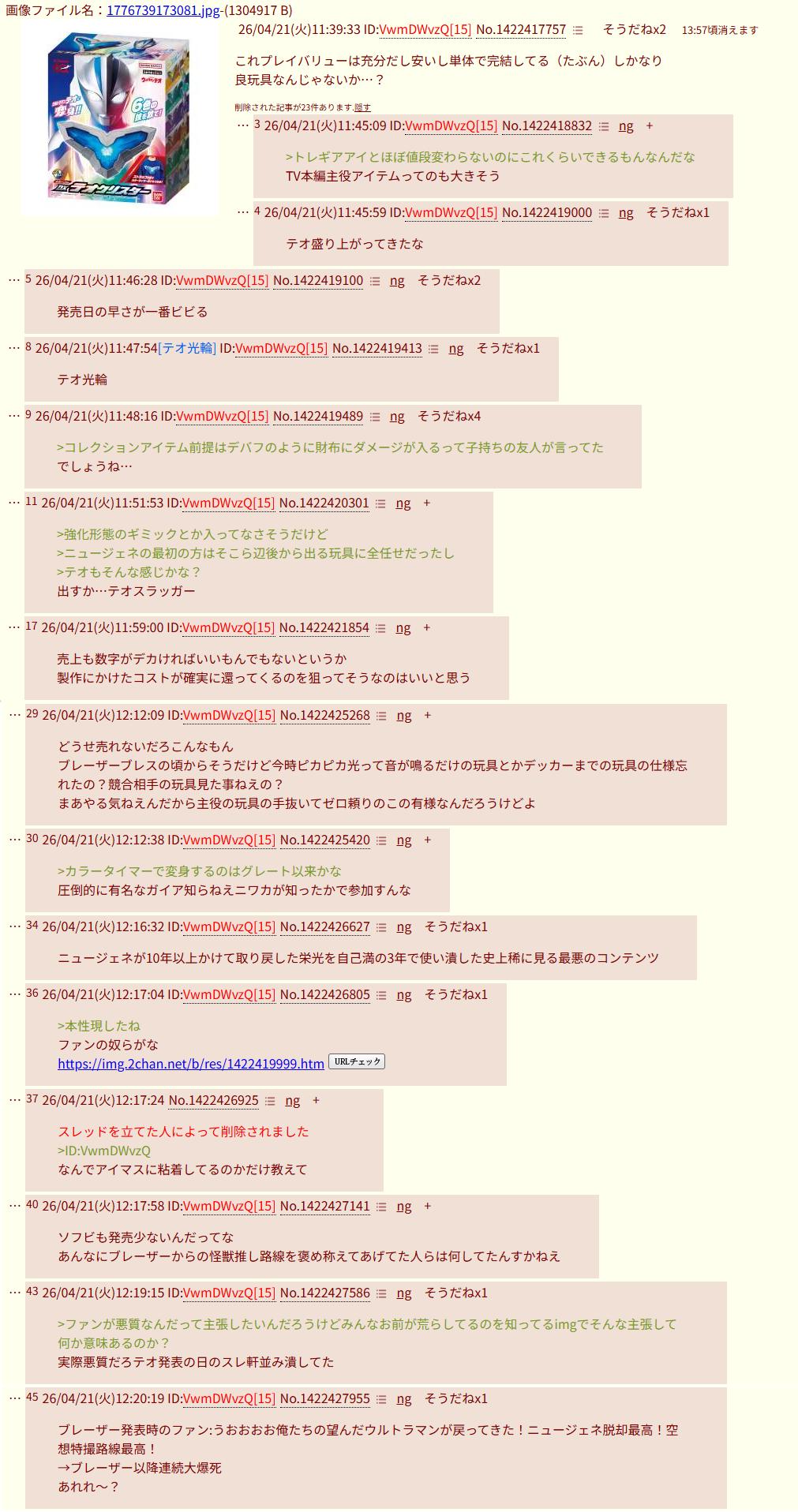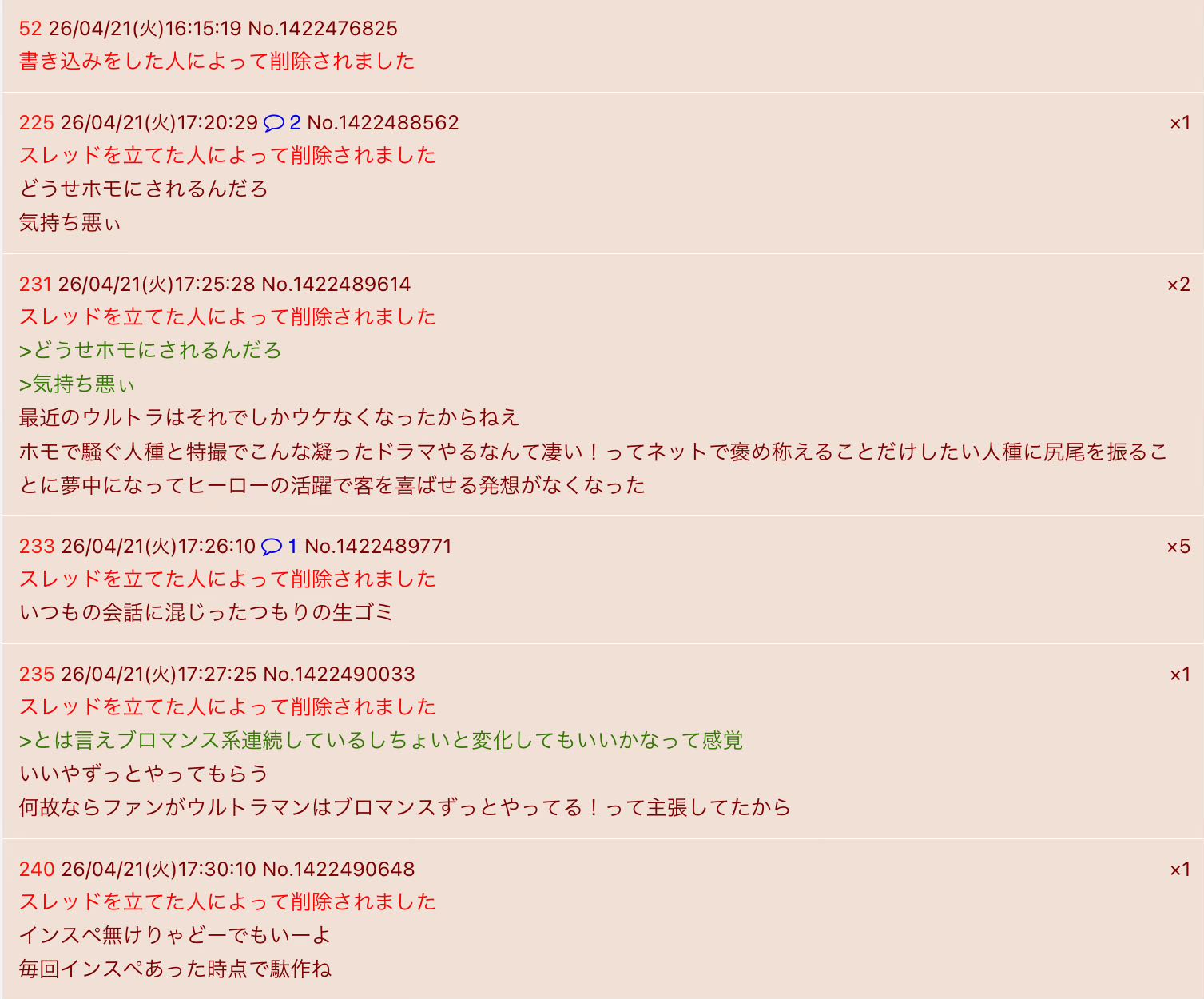 | … | 326/04/21(火)20:41:24No.1422551492+書き込みをした人によって削除されました |