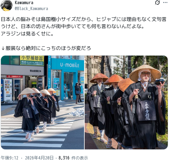 街でヒジャブしてても坊さんと同じ様に必要なことだからしてることなんだなって理解の目を向けなきゃあかんよ