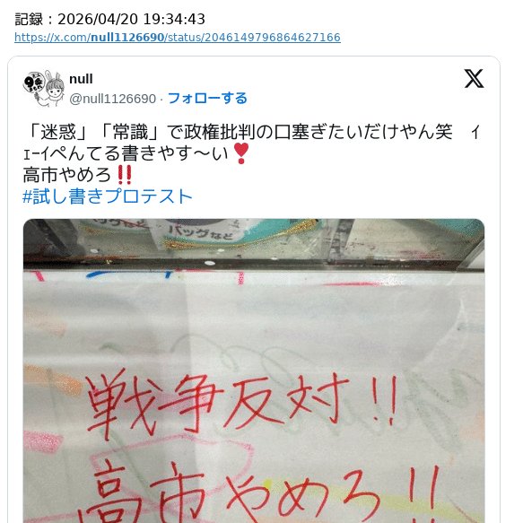 | … | 2226/04/21(火)23:02:15No.1422605856そうだねx7「試し書きプロテスト」からにじみ出る頭悪さ |
