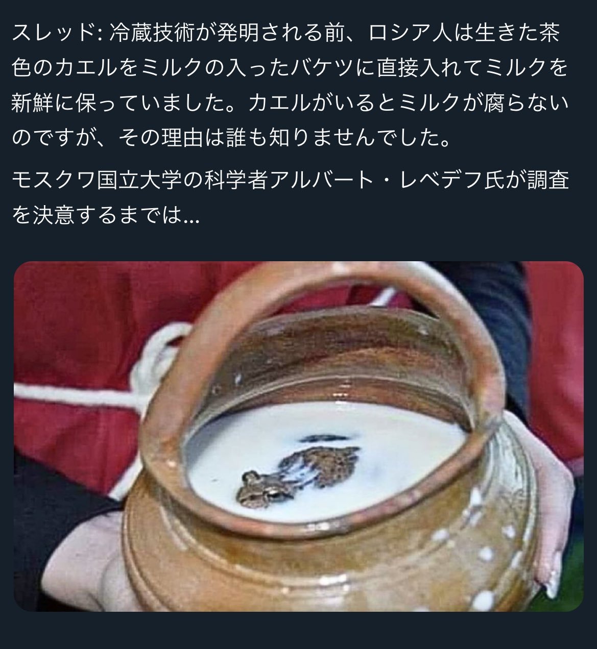 | … | 2826/04/21(火)23:50:02No.1422620826+何がどうなったらカエルを浸けておくとミルクが長持ちするんだぜ! などという生活の知恵を発見できたんだろ |