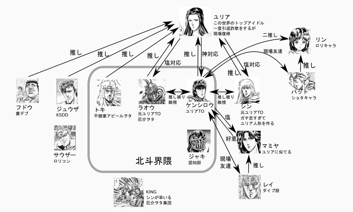| … | 3826/04/21(火)23:56:23No.1422622819+こうして見るとジャギからはユリアに全然矢印向いてないの少し面白いな |