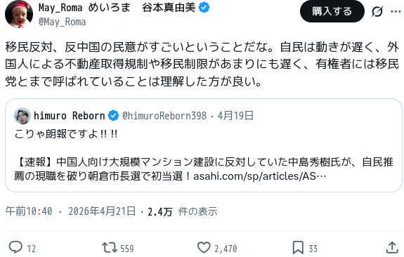 参政党とか日本保守党とか関係なく反外国人掲げた一般人さえ当選しちゃってるよ…市長に