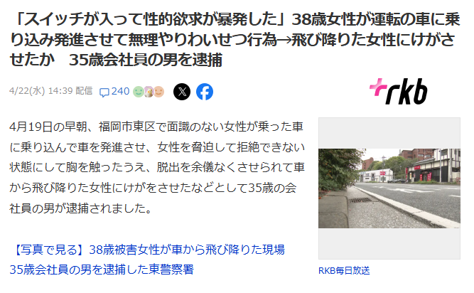 | … | 4226/04/22(水)17:26:20No.1422787147+普通はスムーズに駐車中の車に乗り込んで刃物持ってるからって脅して乳もんだりしないよな… |