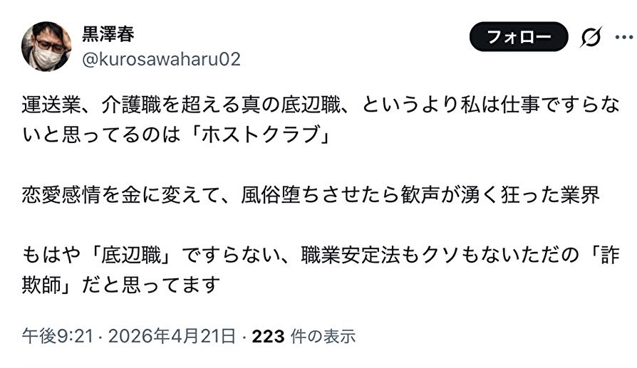 | … | 2126/04/22(水)16:50:06No.1422779597+そういう業界で働くような奴はホストが無くなりゃ次は犯罪しかなくなるから必要な職業なんだよ |