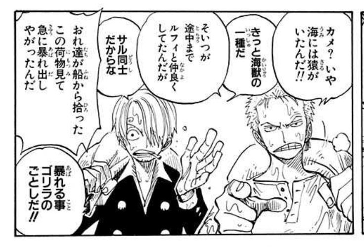 | … | 20426/04/24(金)13:47:08No.1423320234+>個人的に好きな真面目に状況報告するゾロとクソどうでもいいことしか言ってないサンジ サンジがボケなのか… |